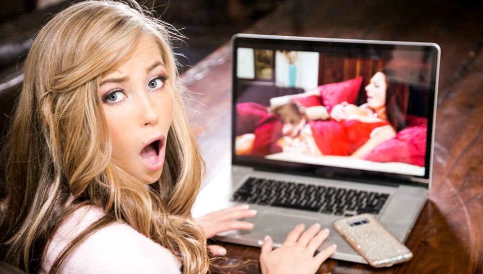 She starts playing with herself not realizing that her step-mom is entering the house from the back door behind her. She puts her laptop screen down. Mindi Mink greets her and asks what she's been up to. Carolina, who wants to confront her, tells her she's watching a movie and she would like to watch it with her. Her mother agrees. They sit down in the living room and Carolina turns it back on.